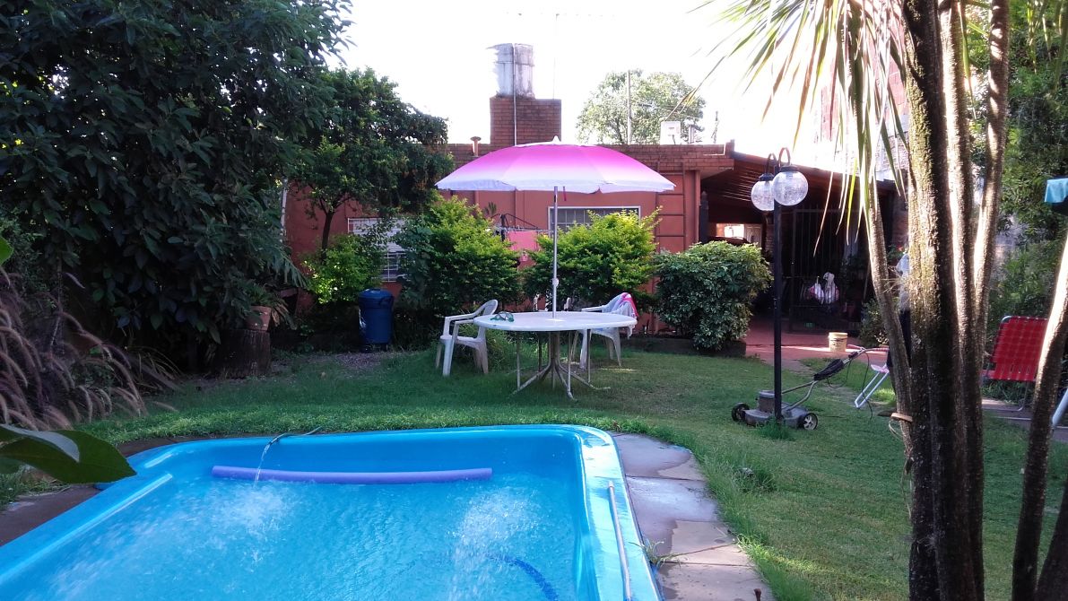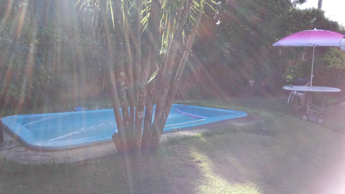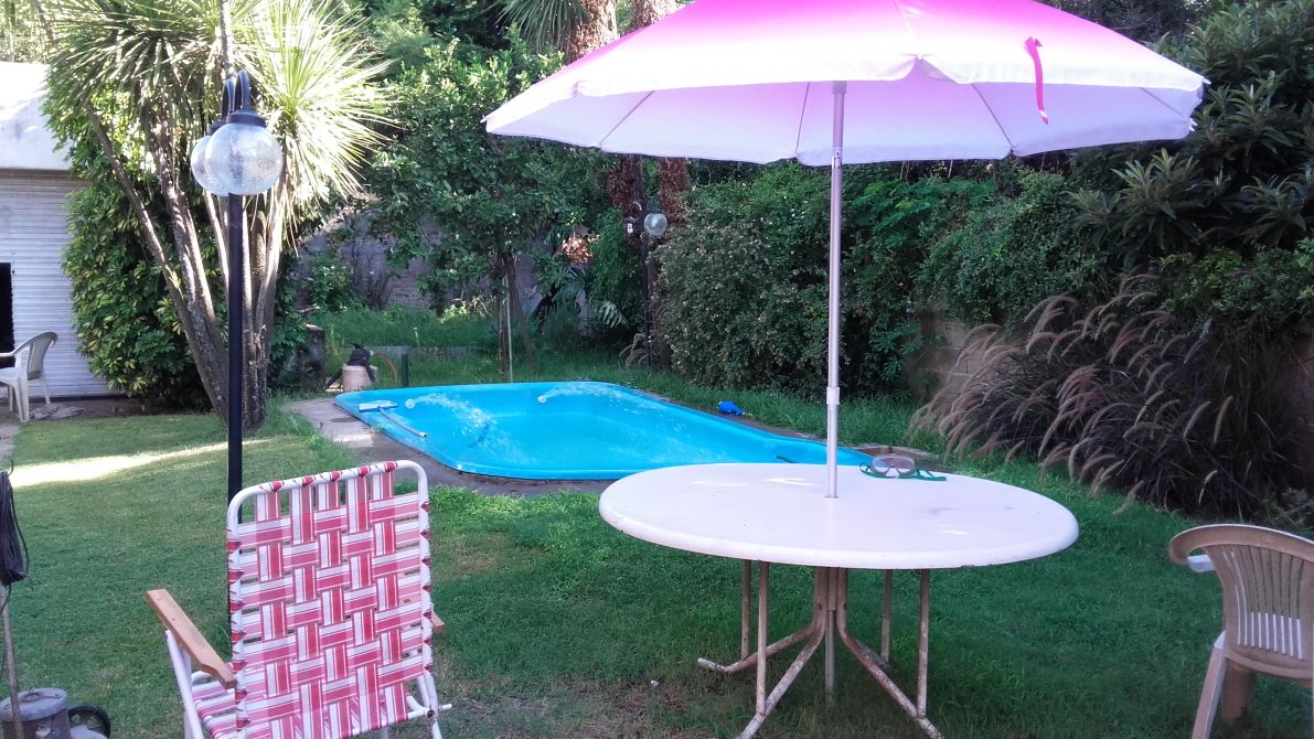 Amplio fondo libre con plantas, pileta de fibra de 6.00 x 3.00 aproximadamente con sistema de bombas y filtros.