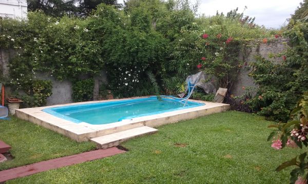 Fondo Libre con pileta de Fibre de 4x3 c instalaciones pared perimetral, escalera de material de acceso a terraza con baranda y Baldosa. Pasillo Lateral de Accesoi al frente