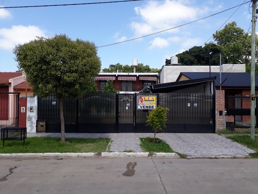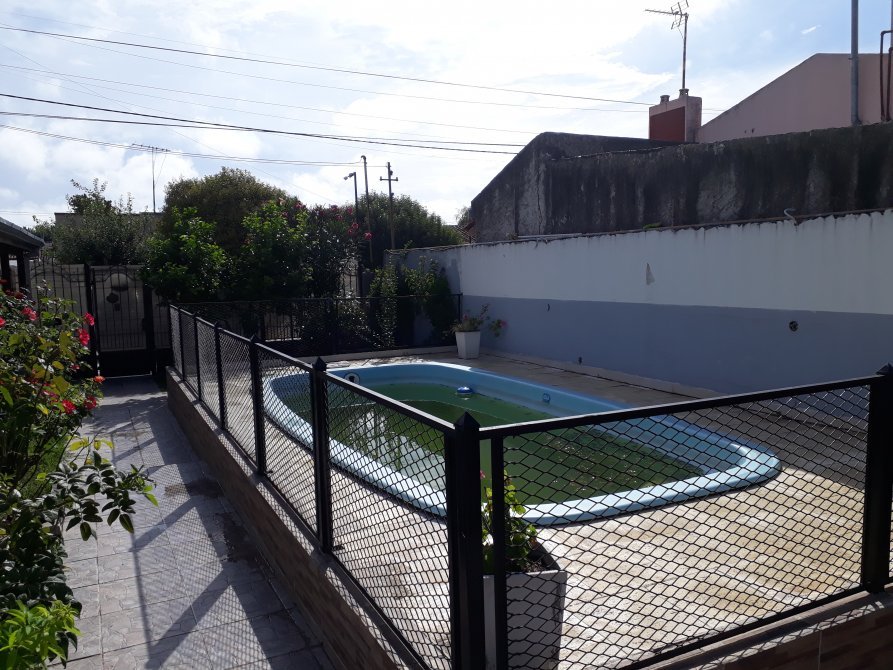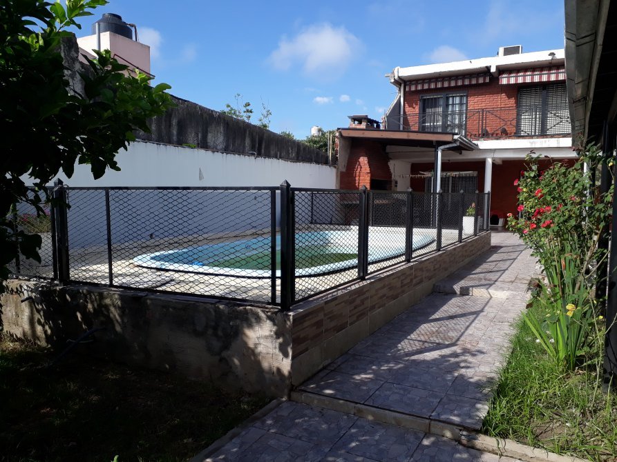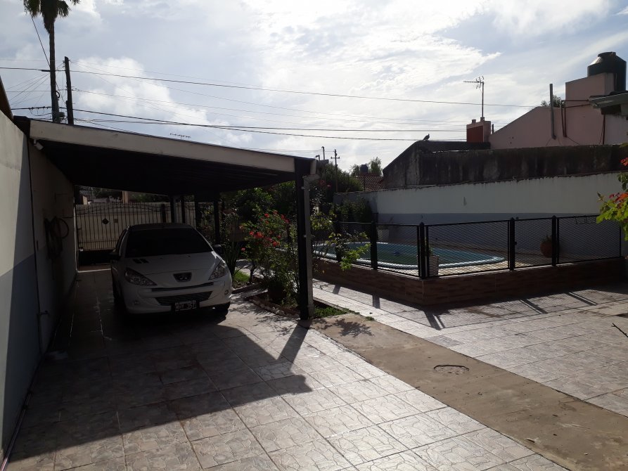 Cochera semi cubierta para dos o tres vehículos, patio semi cubierto con parrilla, terreno libre y pileta de natación de fibra.