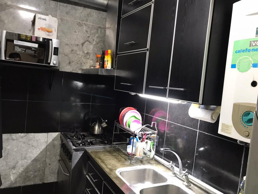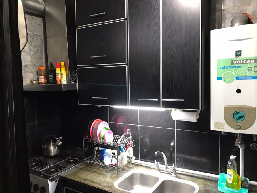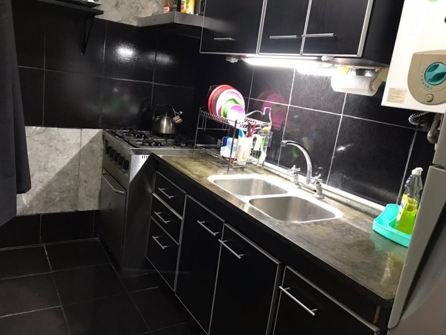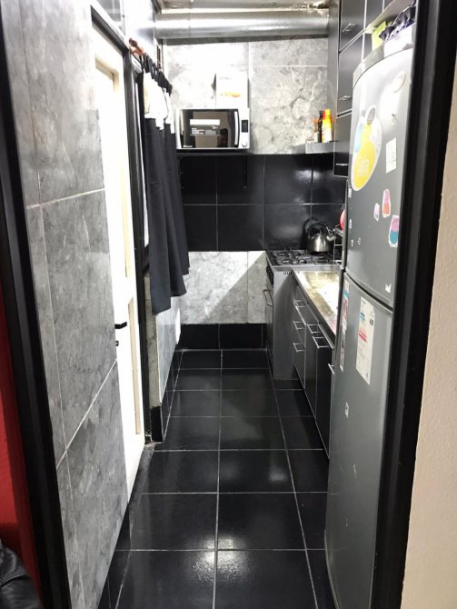 Cocina tipo Kitchenet, cubierta de elegantes cerámicos en pared, amoblamientos modernos
